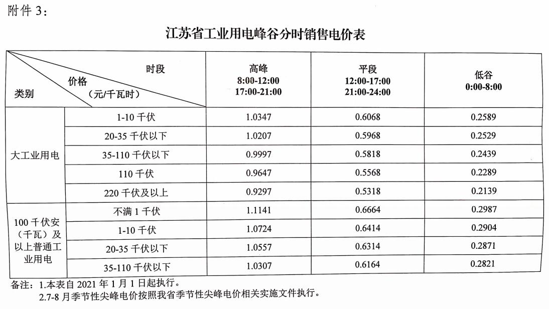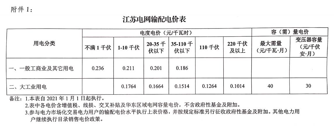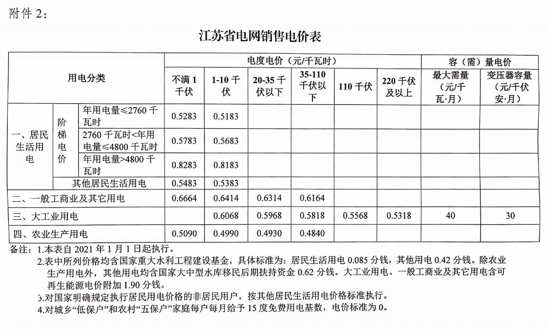 三、為應(yīng)對新冠疫情影響,今年國家實(shí)施階段性降低企業(yè)用電成本政策,本年度繼續(xù)執(zhí)行現(xiàn)行輸配電價(jià)和銷售電價(jià)。本通知所附江蘇電網(wǎng)輸配電價(jià)和銷售電價(jià)自2021年1月1日起執(zhí)行。