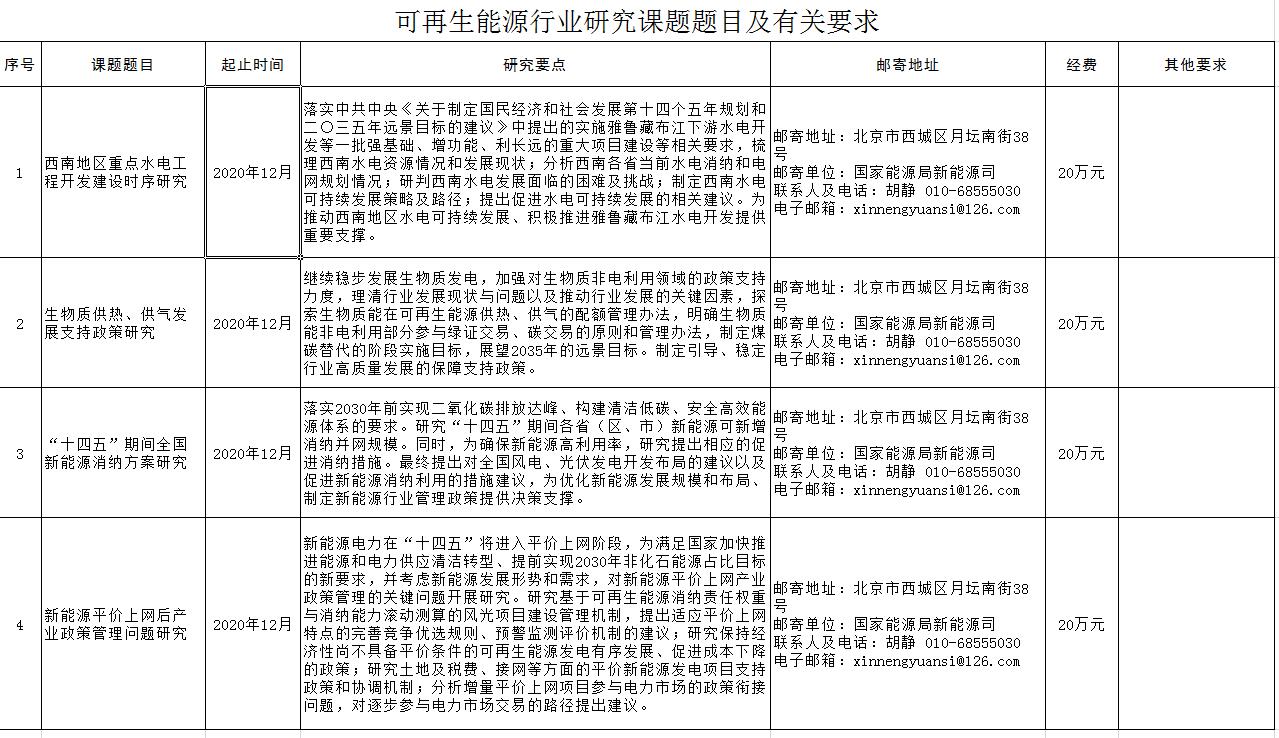 據國家能源局官網消息:根據可再生能源領域規(guī)劃重大問題專題研究工作需要,按照國家能源局有關規(guī)定,國家能源局可再生能源行業(yè)研究課題招標有關事項公告如下: