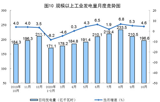 電力生產(chǎn)增速略有放緩。10月份,發(fā)電量6094億千瓦時,同比增長4.6%,增速比上月回落0.7個百分點;日均發(fā)電量196.6億千瓦時,環(huán)比減少13.9億千瓦時。1—10月份,發(fā)電量60288億千瓦時,同比增長1.4%。