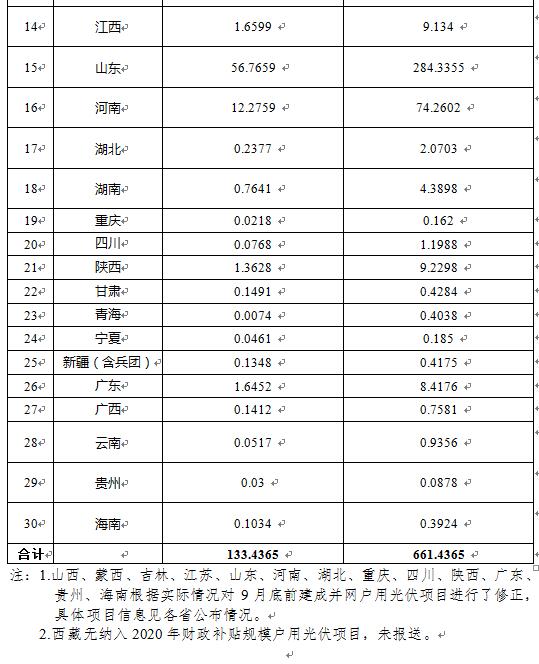 按照《國(guó)家能源局關(guān)于2020年風(fēng)電、光伏發(fā)電項(xiàng)目建設(shè)有關(guān)事項(xiàng)的通知》(國(guó)能發(fā)新能〔2020〕17號(hào),以下簡(jiǎn)稱(chēng)《通知》)和《國(guó)家能源局綜合司關(guān)于2019年戶(hù)用光伏項(xiàng)目信息公布和報(bào)送有關(guān)事項(xiàng)的通知》(國(guó)能綜通新能〔2019〕45號(hào))關(guān)于戶(hù)用光伏項(xiàng)目管理有關(guān)要求,全國(guó)共有30個(gè)省份報(bào)送了戶(hù)用光伏項(xiàng)目信息(西藏?zé)o納入2020年財(cái)政補(bǔ)貼規(guī)模戶(hù)用光伏項(xiàng)目,未報(bào)送)。