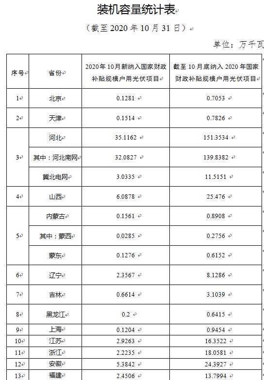 國(guó)家能源局官網(wǎng)消息:據(jù)國(guó)家能源局今日發(fā)布的10月份戶(hù)用光伏項(xiàng)目信息,據(jù)各省級(jí)能源主管部門(mén)、電網(wǎng)企業(yè)報(bào)送信息,經(jīng)國(guó)家可再生能源信息管理中心梳理統(tǒng)計(jì),2020年10月新納入國(guó)家財(cái)政補(bǔ)貼規(guī)模戶(hù)用光伏項(xiàng)目總裝機(jī)容量為133.44萬(wàn)千瓦。截至10月底,全國(guó)累計(jì)納入2020年國(guó)家財(cái)政補(bǔ)貼規(guī)模戶(hù)用光伏項(xiàng)目裝機(jī)容量為661.44萬(wàn)千瓦,已超