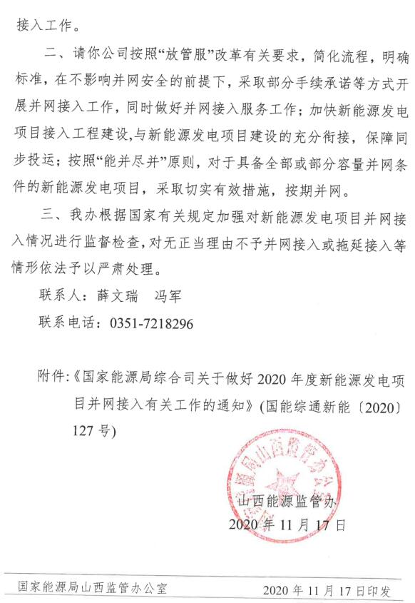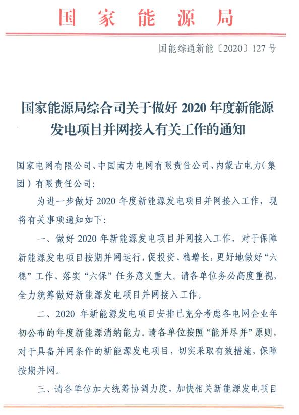 從山西能源監(jiān)管辦了解到:山西能源監(jiān)管辦日前印發(fā)《關(guān)于做好2020年度新能源發(fā)電項目并網(wǎng)接入有關(guān)工作的通知》,要求按照“能并盡并”原則,對于具備全部或部分容量并網(wǎng)條件的新能源發(fā)電項目,采取切實有效措施,全力統(tǒng)籌做好新能源發(fā)電項目并網(wǎng)接入工作,確保按期并網(wǎng)。