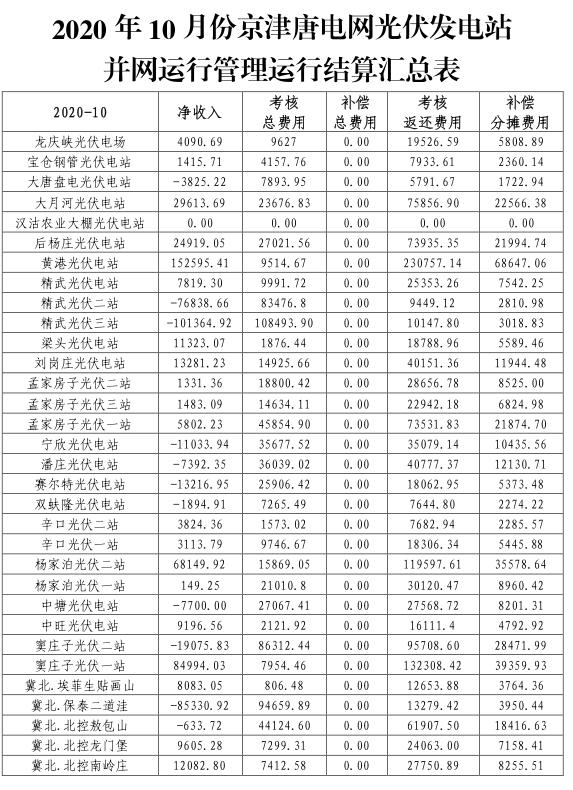 2020年10月份京津唐電網(wǎng)光伏發(fā)電站并網(wǎng)運行管理運行結(jié)算匯總表