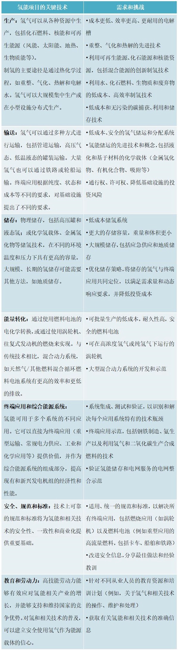 《計(jì)劃》中列舉了當(dāng)前美國能源部氫能項(xiàng)目的關(guān)鍵技術(shù)、需求和挑戰(zhàn),涉及氫氣生產(chǎn)、輸送、儲(chǔ)存、能量轉(zhuǎn)化、終端應(yīng)用以及標(biāo)準(zhǔn)和教育相關(guān)的氫能全產(chǎn)業(yè)鏈。