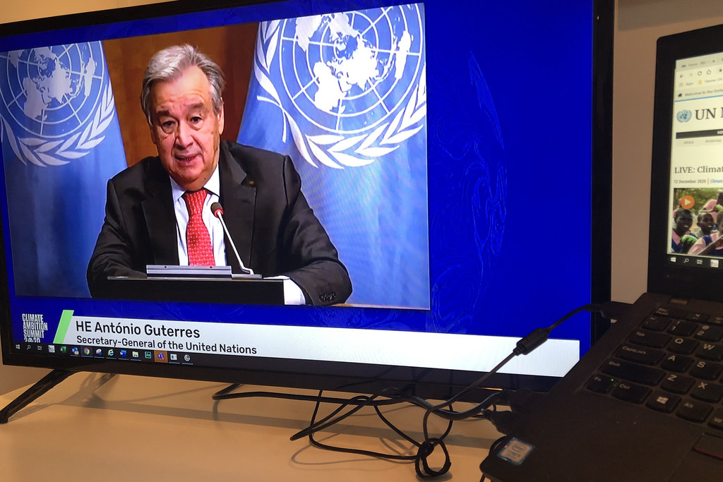 聯(lián)合國秘書長古特雷斯通過線上方式在“2020氣候雄心峰會”上致辭。