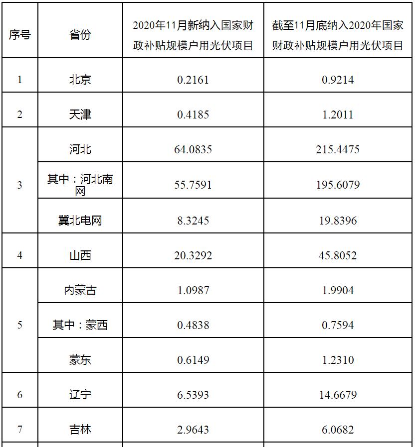 附表:納入2020年國(guó)家財(cái)政補(bǔ)貼規(guī)模戶用光伏項(xiàng)目裝機(jī)容量統(tǒng)計(jì)表(截至2020年11月30日)