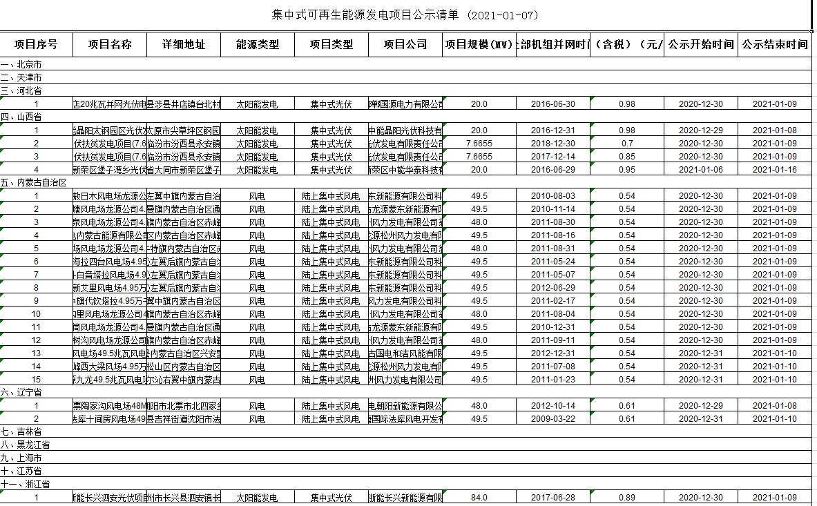 從國家電網(wǎng)新能源云獲悉:今日(1月7日),國家電網(wǎng)發(fā)布2021年第一批集中式可再生能源發(fā)電項(xiàng)目公示清單,共計(jì)123個(gè)太陽能、風(fēng)電補(bǔ)貼項(xiàng)目。公示時(shí)間為1月6日至16日。詳情如下: