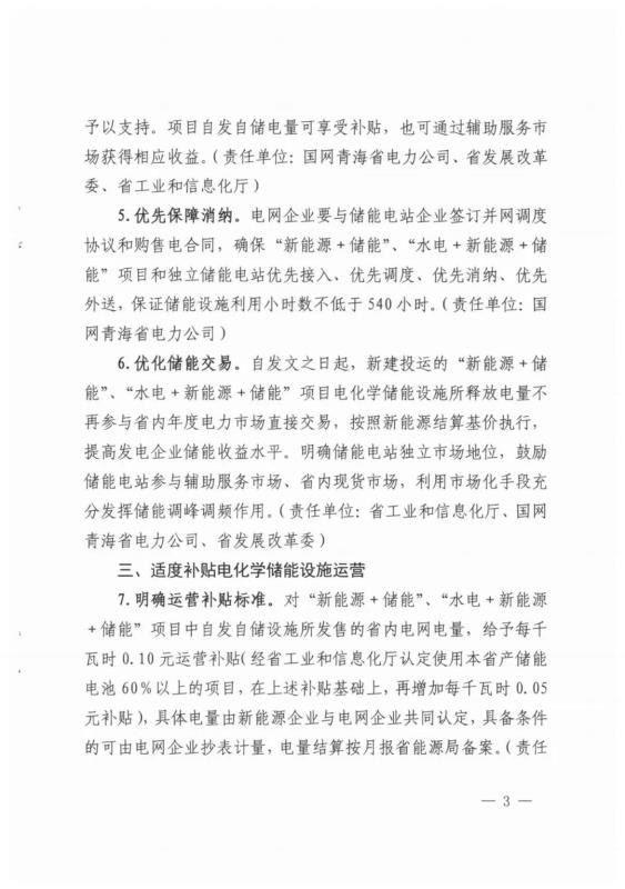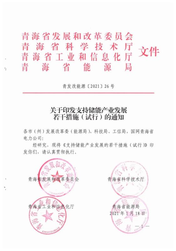 1月18日,青海省發(fā)改委、科技廳、工信廳、能源局聯(lián)合下發(fā)《關(guān)于印發(fā)支持儲能產(chǎn)業(yè)發(fā)展若干措施(試行)的通知》,對"新能源+儲能” 、"水電+新能源 + 儲能”項目中自發(fā)自儲設(shè)施所發(fā)售的省內(nèi)電網(wǎng)電量,給予每千瓦時0.10元運營補貼,如果經(jīng)省工業(yè)和信息化廳認(rèn)定使用本省產(chǎn)儲能電池60%以上的項目,在上述補貼基