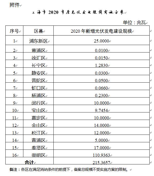 根據(jù)《國家能源局關于2020年風電、光伏發(fā)電項目建設有關事項的通知》(國能發(fā)新能〔2020〕17號),結(jié)合本年度國家補貼競價項目實際申報和推進情況,經(jīng)委托上海投資咨詢公司對各區(qū)上報的2020年度光伏新增規(guī)模實施計劃評估,確認本市2020年度光伏發(fā)電建設規(guī)模為215.3657兆瓦(詳見附件)。各區(qū)在不發(fā)生棄光、滿足消納條件的前提下,備案總規(guī)模不受規(guī)模實施方案的限制,相關開發(fā)區(qū)光伏新增規(guī)模按屬地原則納入相應區(qū)規(guī)模。2020年建設規(guī)模的完成情況納入節(jié)能降碳目標責任評價考核體系。
