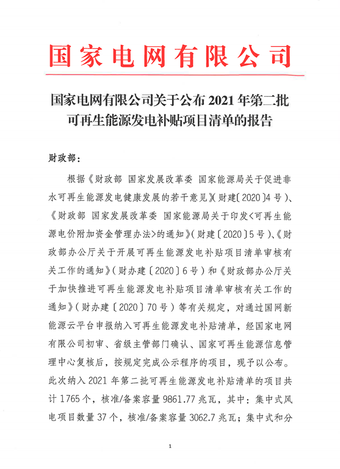 2021年1月31日,國(guó)家電網(wǎng)公布2021年第二批可再生能源發(fā)電補(bǔ)貼項(xiàng)目清單。此次納入2021年第二批可再生能源發(fā)電補(bǔ)貼清單的項(xiàng)目共計(jì)1765個(gè),核準(zhǔn)/備案容量9861.77MW。