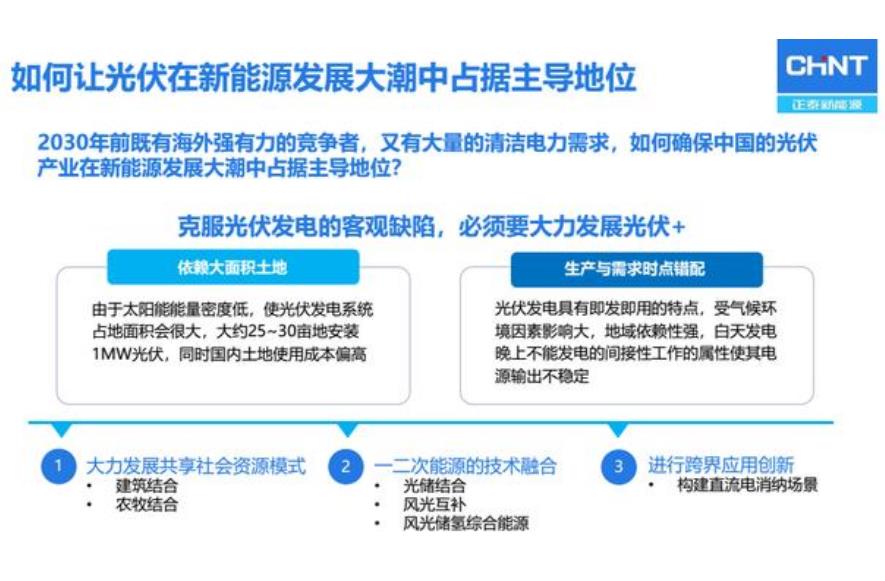 隨著減排目標(biāo)的提出,光伏在市場(chǎng)和經(jīng)濟(jì)性上已有較強(qiáng)的競(jìng)爭(zhēng)力。在未來(lái)發(fā)展中,如何避免缺陷和短板使得光伏在新能源發(fā)展大潮中占據(jù)更加主導(dǎo)的地位?陸川表示,結(jié)合正泰新能源多年來(lái)的客觀實(shí)踐,要克服光伏發(fā)電的客觀缺陷,必須要大力發(fā)展光伏+,通過(guò)光伏+的形式增加其他資源的利用,使得光伏在更匹配用電需求的同時(shí)節(jié)約土地資源。具體可通過(guò)大力發(fā)展共享社會(huì)資源,一二次能源的技術(shù)融合,進(jìn)行跨界應(yīng)用創(chuàng)新三種模式。