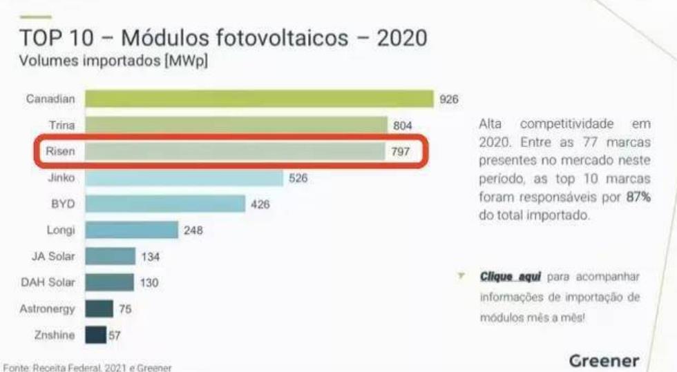 近日,巴西權(quán)威能源研究機(jī)構(gòu)Greener發(fā)布的最新報告顯示,在2020年巴西光伏組件進(jìn)口量排名統(tǒng)計中,前十大品牌占進(jìn)口總量的87%。其中,光伏龍頭企業(yè)東方日升位列第三位。