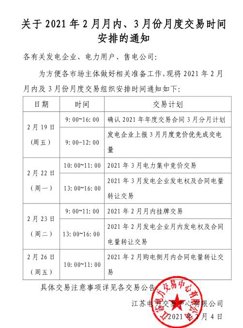 江蘇2021年2月月內(nèi)、3月份月度交易時間安排