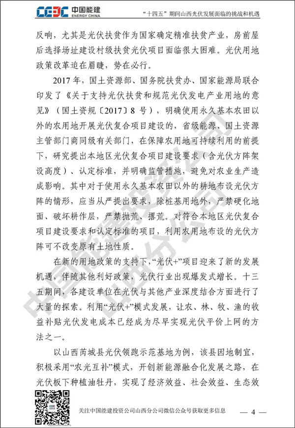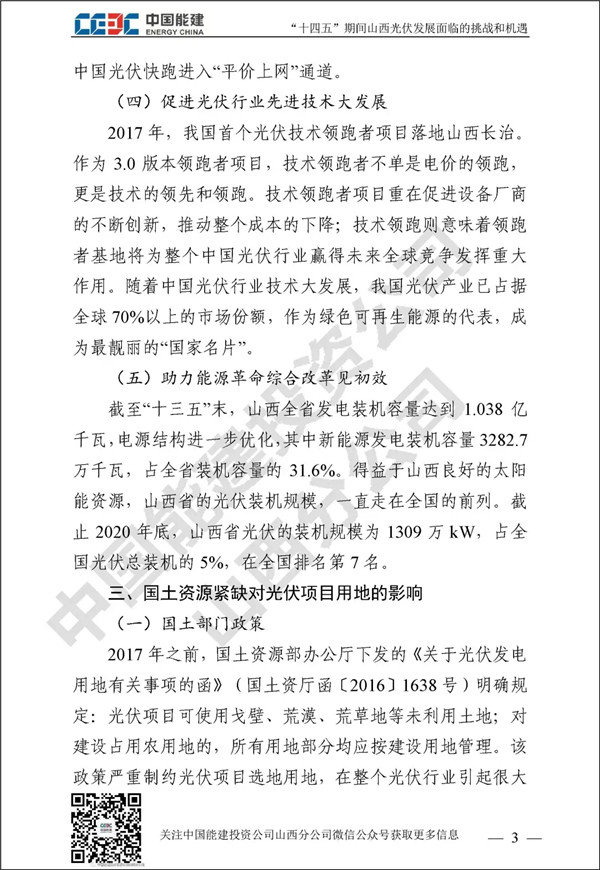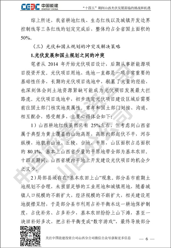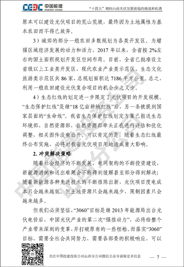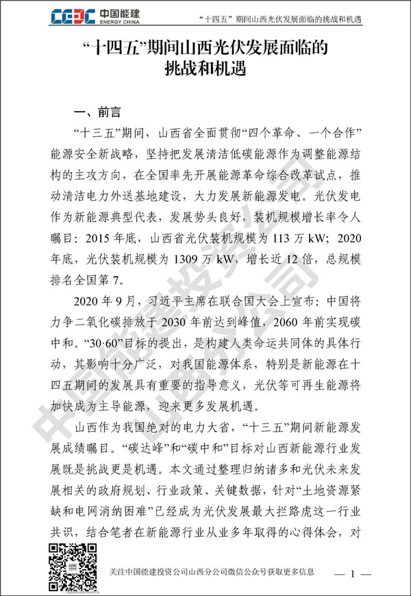 山西作為我國絕對的電力大省,“十三五”期間新能源發(fā)展成績矚目!疤歼_峰”和“碳中和”目標對山西新能源行業(yè)發(fā)展既是挑戰(zhàn)更是機遇。中國能建投資公司山西分公司通過對諸多和光伏未來發(fā)展相關(guān)的政府規(guī)劃、行業(yè)政策、關(guān)鍵數(shù)據(jù)進行歸納整理,并進行分析研究,針對“土地和消納土地資源緊缺和電網(wǎng)消納困難”已經(jīng)成為光伏發(fā)展最大攔路虎這一行業(yè)