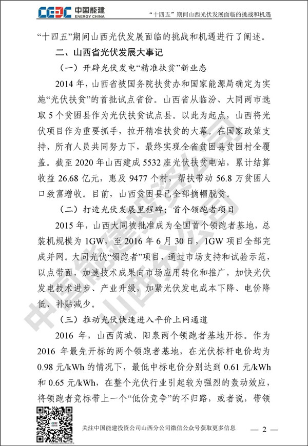 山西作為我國絕對的電力大省,“十三五”期間新能源發(fā)展成績矚目。“碳達峰”和“碳中和”目標對山西新能源行業(yè)發(fā)展既是挑戰(zhàn)更是機遇。中國能建投資公司山西分公司通過對諸多和光伏未來發(fā)展相關(guān)的政府規(guī)劃、行業(yè)政策、關(guān)鍵數(shù)據(jù)進行歸納整理,并進行分析研究,針對“土地和消納土地資源緊缺和電網(wǎng)消納困難”已經(jīng)成為光伏發(fā)展最大攔路虎這一行業(yè)共識,結(jié)合新能源行業(yè)現(xiàn)狀,對“十四五”期間山西光伏發(fā)展面臨的挑戰(zhàn)和機遇進行了詳細闡述。