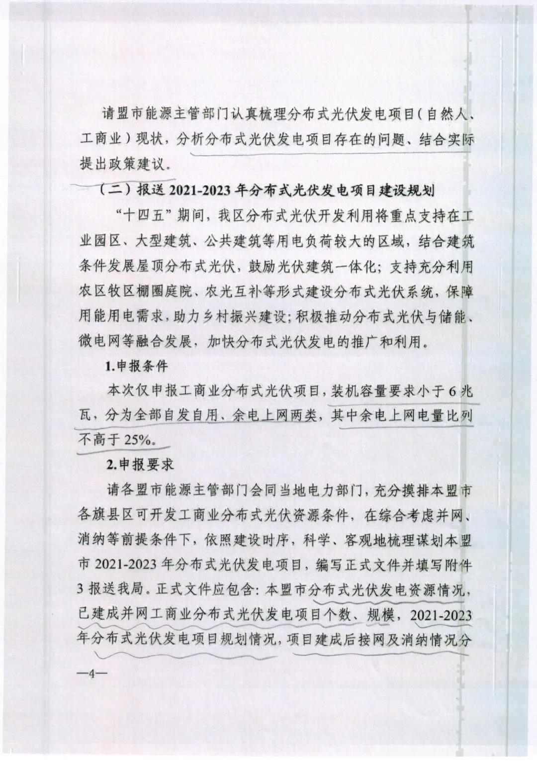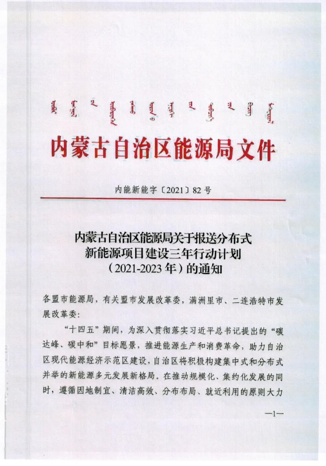 日前,內(nèi)蒙古自治區(qū)能源局發(fā)布關(guān)于報送分布式新能源項目建設(shè)三年行動計劃(2021-2023年)的通知,文件要求,各盟市能源主管部門全面梳理分布式新能源項目的發(fā)展現(xiàn)狀,并結(jié)合實際梳理申報2021-2021年分布式新能源開發(fā)建設(shè)規(guī)劃。文件明確要加快發(fā)展分布式光伏項目!笆奈濉逼陂g,內(nèi)蒙古自治區(qū)分布式光伏開發(fā)利用將重點支持在工業(yè)園