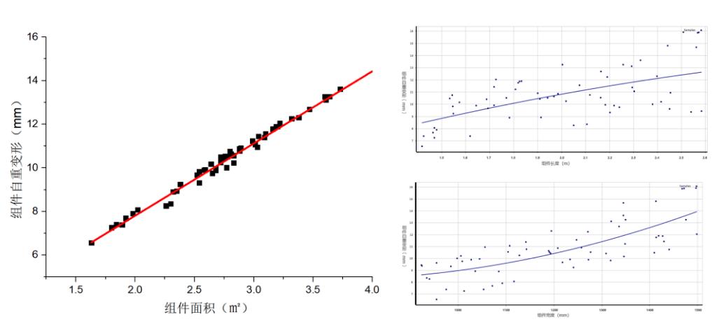 超大尺寸組件除了邊框應(yīng)力的增加,僅自身重量就會(huì)導(dǎo)致其變形量顯著增加,如下圖所示,組件面積3㎡時(shí),自重變形可達(dá)11mm;右圖進(jìn)一步可以看出,組件變寬對變形量的影響大于變長。因此在組件的使用及運(yùn)輸、搬運(yùn)過程中,如此大的變形勢必大大增加電池片隱裂的風(fēng)險(xiǎn),為電站的發(fā)電收益帶來隱患。