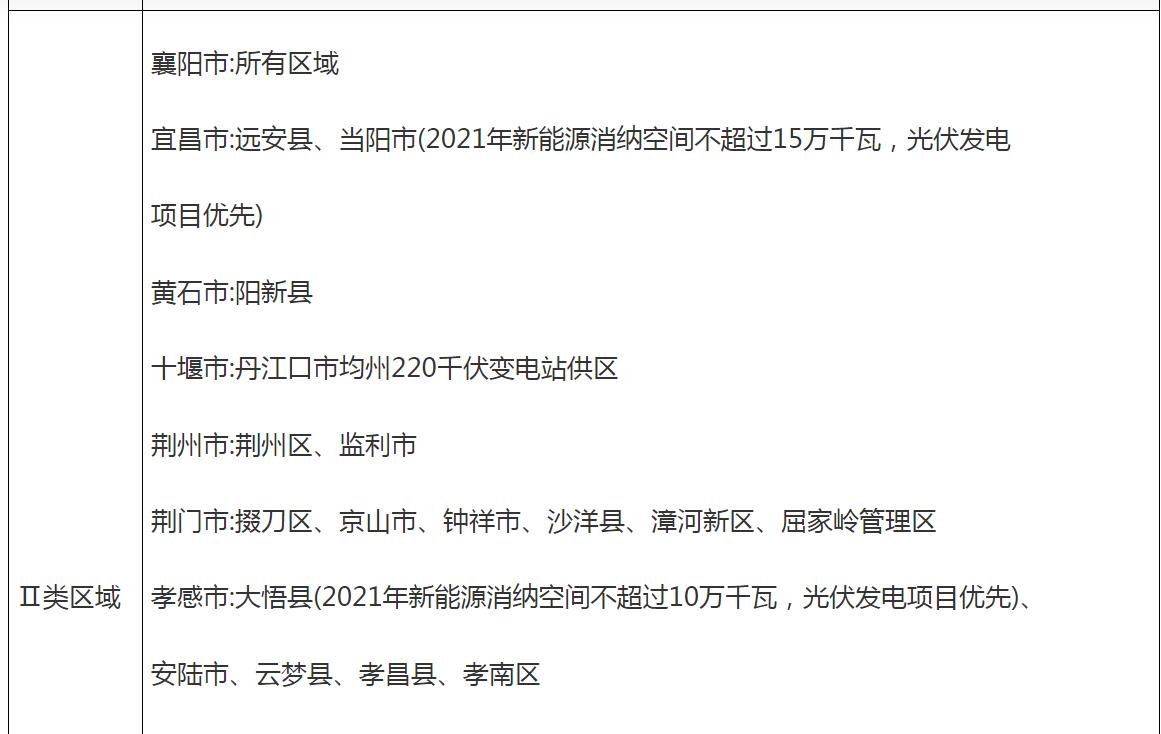 Ⅱ類區(qū)域為消納局部受限區(qū)域。包括襄陽市、宜昌市(遠安縣、當陽市)、黃石市(陽新縣)、十堰市(丹江口市均州220千伏變電站供區(qū))、荊州市(荊州區(qū)、監(jiān)利市)、荊門市(掇刀區(qū)、京山市、鐘祥市、沙洋縣、漳河新區(qū)、屈家?guī)X管理區(qū))、孝感市(大悟縣、安陸市、云夢縣、孝昌縣、孝南區(qū))、黃岡市(團風縣、浠水縣、蘄春縣、武穴市、黃梅縣、龍感湖管理區(qū))、咸寧市(通山縣、通城縣、崇陽縣)、恩施州(建始縣、巴東縣)、天門市和神農架林區(qū)。
