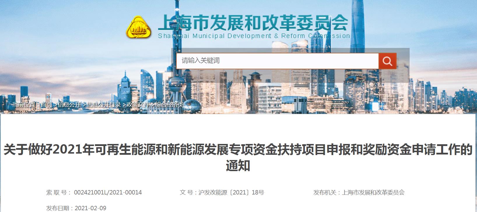 根據(jù)《上海市節(jié)能減排(應對氣候變化)專項資金管理辦法》(滬府辦發(fā)〔2017〕9號)和《上海市可再生能源和新能源發(fā)展專項資金扶持辦法(2020版)》(滬發(fā)改規(guī)范〔2020〕7號),現(xiàn)組織開展2021年可再生能源和新能源發(fā)展專項資金扶持項目申報和獎勵資金申請工作,有關要求通知如下。