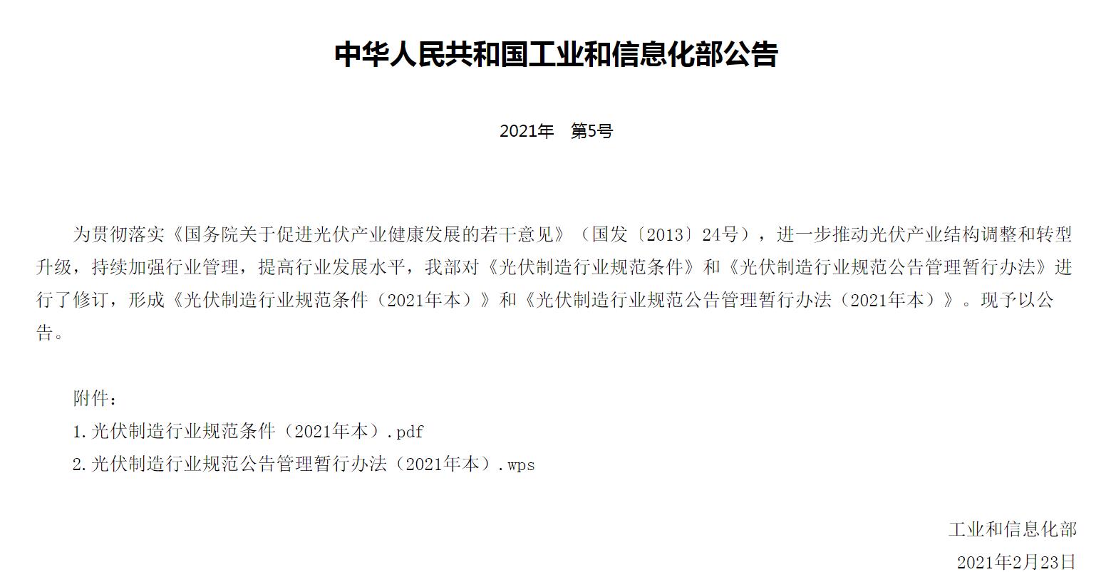 (五)本規(guī)范條件自2021年3月15日起實(shí)施。2018年1月15日公布的《光伏制造行業(yè)規(guī)范條件(2018年本)》(工業(yè)和信息化部公告2018年第2號(hào))同時(shí)廢止。