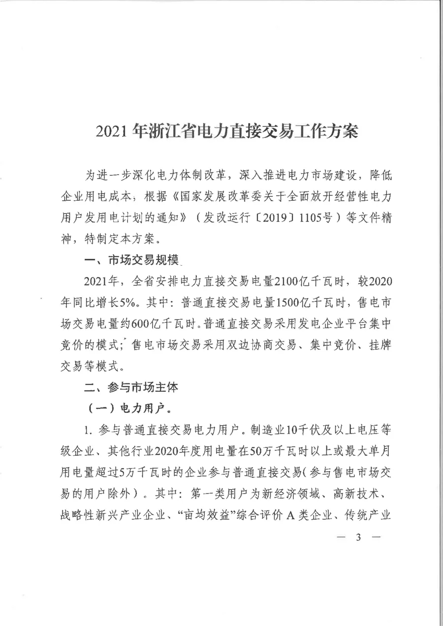 近日,浙江省發(fā)展改革委、浙江省能源局、浙江能源監(jiān)管辦聯(lián)合印發(fā)《2021年浙江省電力直接交易工作方案》,公布了浙江省普通直接交易和售電市場(chǎng)交易各項(xiàng)安排。2021年,全省可參與年度電力直接交易用戶數(shù)量將達(dá)到20多萬(wàn)家。2021年,浙江省安排電力直接交易電量2100億千瓦時(shí),較2020年同比增長(zhǎng)5%。其中:普通直接交易