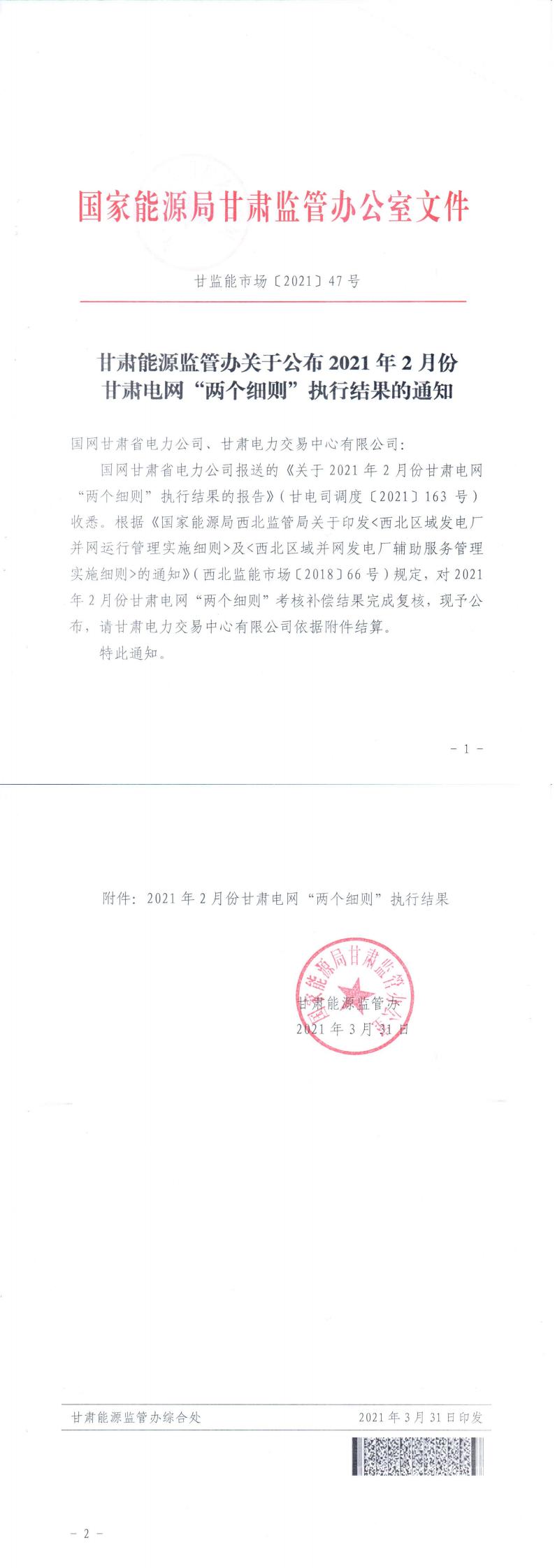 2021年2月份甘肅電網“兩個細則”執(zhí)行結果公布(光伏)