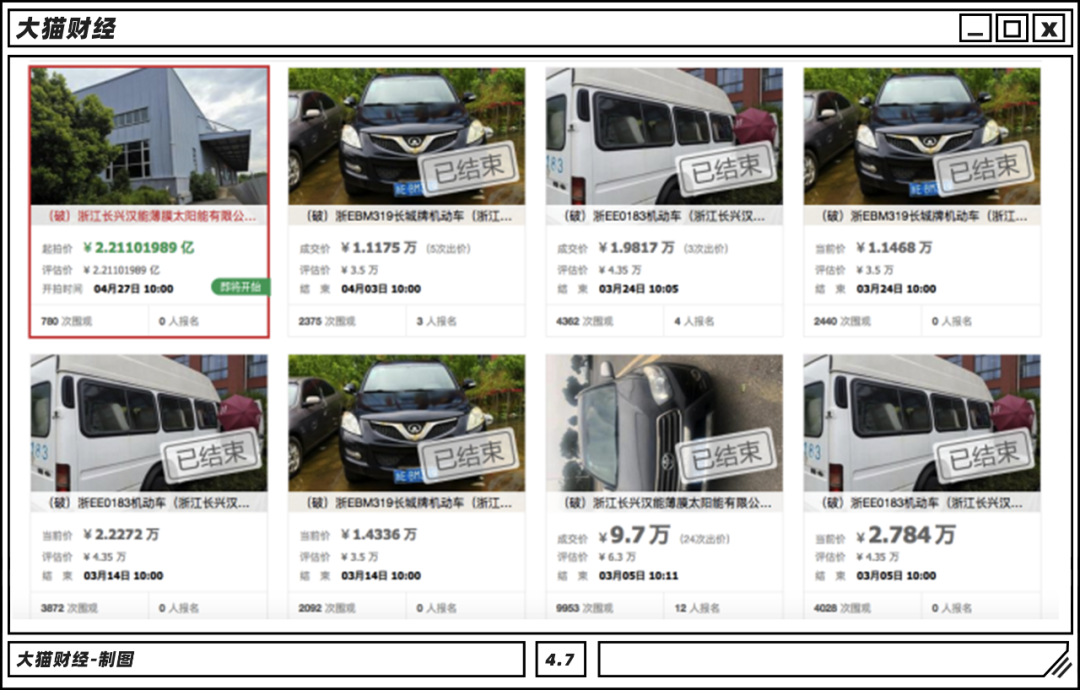 最近,浙江湖州有家公司破產了。拍賣的資產各式各樣,幾輛二手車標價一兩萬,但沒人買,房產2.21億起拍,一點也不打折,看來還是房子值錢。這家公司叫浙江長興漢能,看名字就知道,是鼎鼎大名的“漢能系”公司,他的老板,是前“中國首富”李河君。浙江這公司有地可賣,對債權人來講還算幸運的。最慘的就是啥