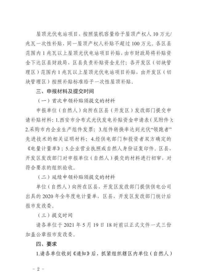 根據(jù)通知,自項(xiàng)目并網(wǎng)起,給予投資人0.25元/度補(bǔ)貼;屋頂光伏電站項(xiàng)目,按照裝機(jī)容量給予屋頂產(chǎn)權(quán)人10萬(wàn)元/兆瓦一次性補(bǔ)貼、同一屋頂產(chǎn)權(quán)人補(bǔ)貼不超過(guò)100萬(wàn)元。