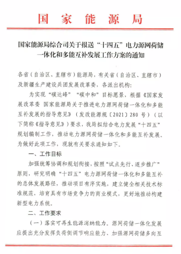 通知要求,各省級能源主管部門應積極開展電力源網(wǎng)荷儲一體化和多能互補項目及實施方案的分類組織論證、預期效果分析等工作,研究制定相關工作方案并于2021年5月30日前報送至能源局電力司。