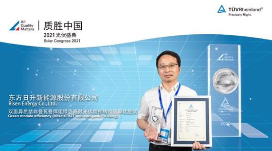 4月28日,由德國萊茵TUV集團(以下簡稱“TUV萊茵”)主辦的第七屆“質勝中國”光伏盛典暨“質勝中國優(yōu)勝獎”頒獎典禮在杭州召開。光伏龍頭企業(yè)東方日升受邀出席,并憑借雄厚的研發(fā)實力和高效的組件產品,榮膺“雙面組光伏組件戶外發(fā)電量優(yōu)勝獎”、“雙面異質結非疊瓦疊焊組綠色高效光伏組件轉換效率優(yōu)勝獎”兩項大獎。質勝中國