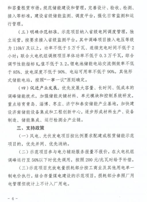 從山東省能源局獲悉,近日,山東省發(fā)展和改革委員會(huì)、山東省能源局 、國(guó)家能源局山東監(jiān)管辦公室聯(lián)合印發(fā) 《關(guān)于開(kāi)展儲(chǔ)能示范應(yīng)用的實(shí)施意見(jiàn)》的通知,(以下簡(jiǎn)稱《意見(jiàn)》),提出實(shí)施調(diào)峰調(diào)頻優(yōu)先發(fā)電量計(jì)劃獎(jiǎng)勵(lì)、儲(chǔ)能優(yōu)先、充放電量“平進(jìn)平出”、儲(chǔ)能多勞多得等支持政策。風(fēng)電光伏項(xiàng)目配建或租賃儲(chǔ)能的,優(yōu)先并網(wǎng)、優(yōu)