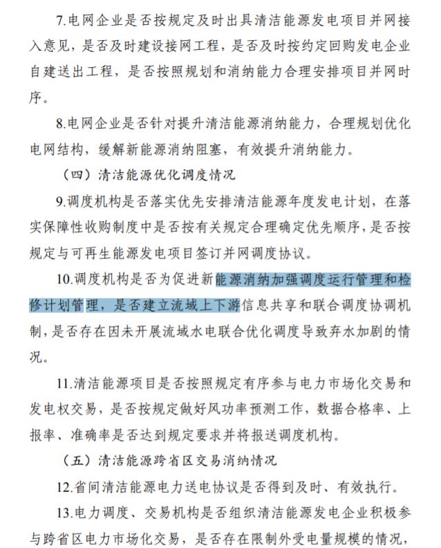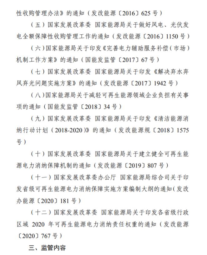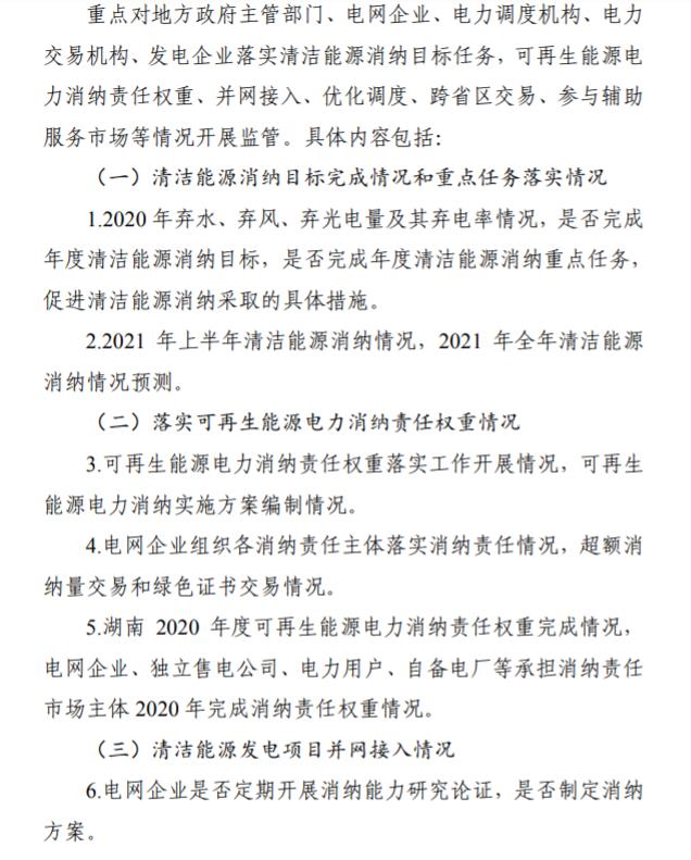 實(shí)施方案明確:重點(diǎn)對(duì)地方政府主管部門、電網(wǎng)企業(yè)、電力調(diào)度機(jī)構(gòu)、電力交易機(jī)構(gòu)、發(fā)電企業(yè)落實(shí)清潔能源消納目標(biāo)任務(wù),可再生能源電力消納責(zé)任權(quán)重、并網(wǎng)接入、優(yōu)化調(diào)度、跨省區(qū)交易、參與輔助服務(wù)市場(chǎng)等情況開展監(jiān)管。