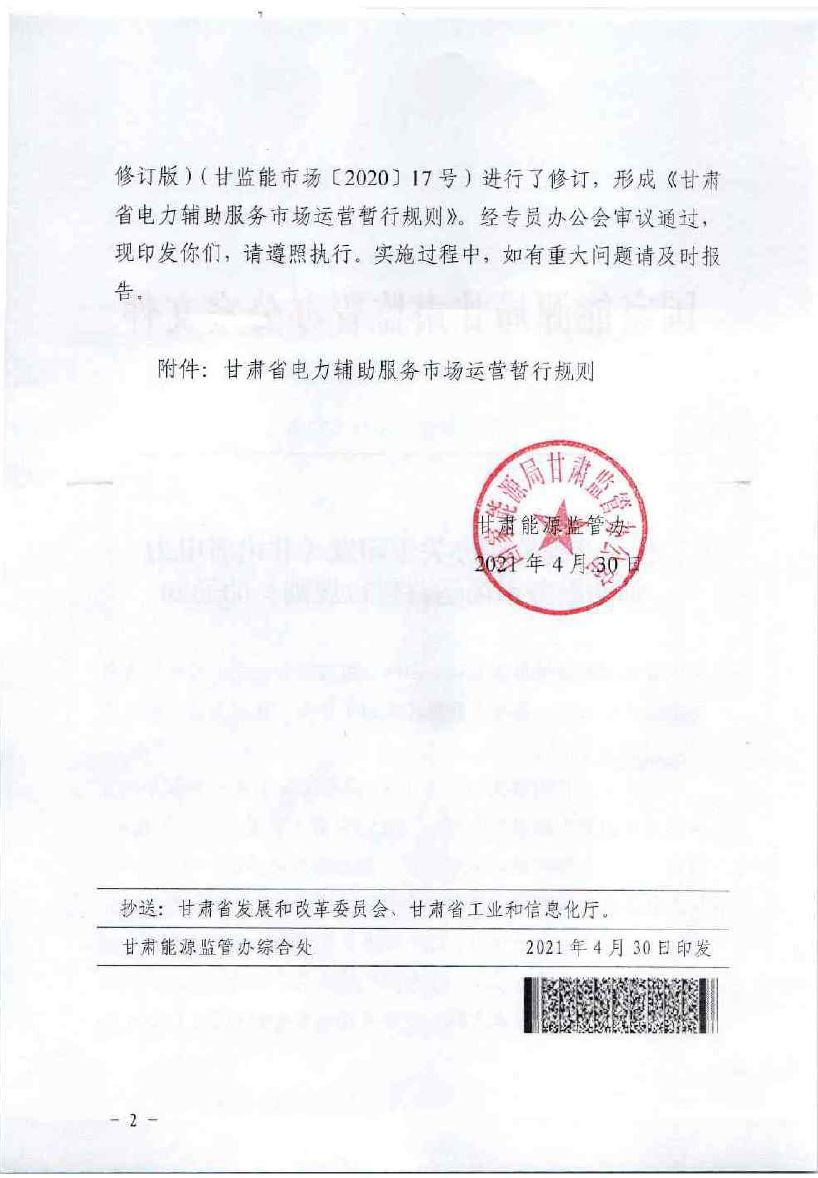 5月6日,甘肅能監(jiān)辦印發(fā)《甘肅省電力輔助服務(wù)市場運營暫行規(guī)則的通知》。通知明確,市場主體包括已取得發(fā)電業(yè)務(wù)許可證(包括豁免范圍內(nèi))的省內(nèi)發(fā)電企業(yè)(包括火電、水電、風電、光電等),以及經(jīng)市場準入的電儲能和需求側(cè)資源,新建機組歸調(diào)后方可提供電力輔助服務(wù)。