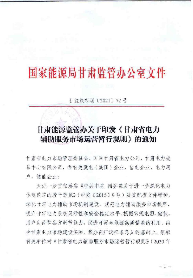5月6日,甘肅能監(jiān)辦印發(fā)《甘肅省電力輔助服務(wù)市場運營暫行規(guī)則的通知》。通知明確,市場主體包括已取得發(fā)電業(yè)務(wù)許可證(包括豁免范圍內(nèi))的省內(nèi)發(fā)電企業(yè)(包括火電、水電、風電、光電等),以及經(jīng)市場準入的電儲能和需求側(cè)資源,新建機組歸調(diào)后方可提供電力輔助服務(wù)。自發(fā)自用式分布式光伏、國家核準的光伏扶貧電站、光熱電站等暫不