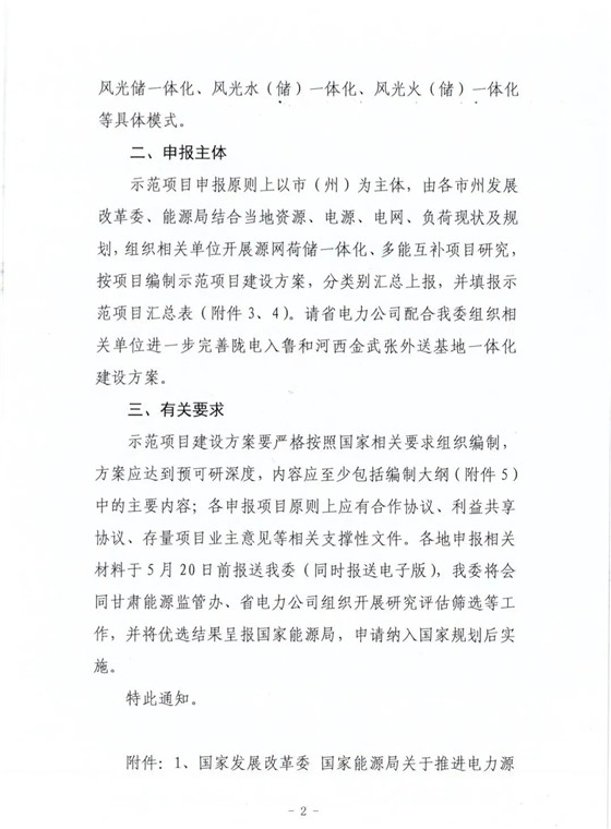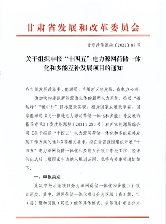 5月6日,甘肅省發(fā)改委發(fā)布《關(guān)于組織申報"十四五"電力源網(wǎng)荷儲一體化和多能互補發(fā)展項目的通知》,擬在全省范圍組織開展"十四五"電力源網(wǎng)荷儲一體化和多能互補發(fā)展項目申報工作,經(jīng)評估優(yōu)選后上報國家申請納入規(guī)劃范圍。通知明確,此次申報示范項目為源網(wǎng)荷儲一體化和多能互補發(fā)展項目兩類:源網(wǎng)荷儲一體化項目分為區(qū)域(省)級