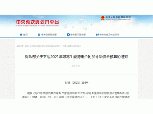 5月10日,財(cái)政部官網(wǎng)發(fā)布關(guān)于下達(dá)2021年可再生能源電價(jià)附加補(bǔ)助資金預(yù)算的通知。