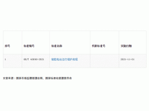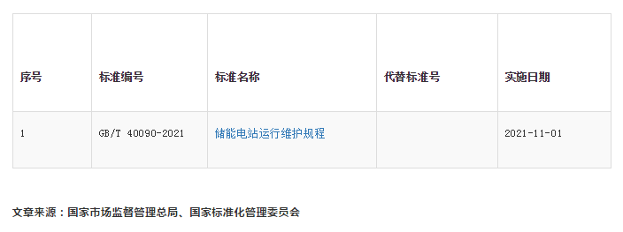 2021年4月30日,國(guó)家市場(chǎng)監(jiān)督管理總局、國(guó)家標(biāo)準(zhǔn)化管理委員會(huì)發(fā)布2021年第5號(hào)標(biāo)準(zhǔn)公告,批準(zhǔn)發(fā)布212項(xiàng)推薦性國(guó)家標(biāo)準(zhǔn)和3項(xiàng)國(guó)家標(biāo)準(zhǔn)修改單,與儲(chǔ)能相關(guān)的GB/T 40090-2021《儲(chǔ)能電站運(yùn)行維護(hù)規(guī)程》正式發(fā)布。