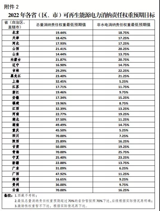 一、從2021年起,每年初滾動發(fā)布各省權(quán)重,同時印發(fā)當年和次年消納責任權(quán)重,當年權(quán)重為約束性指標,各省按此進行考核評估,次年權(quán)重為預(yù)期性指標,各省按此開展項目儲備。2021年各。▍^(qū)、市)消納責任權(quán)重見附件1,2022年各省(區(qū)、市)預(yù)期目標見附件2。