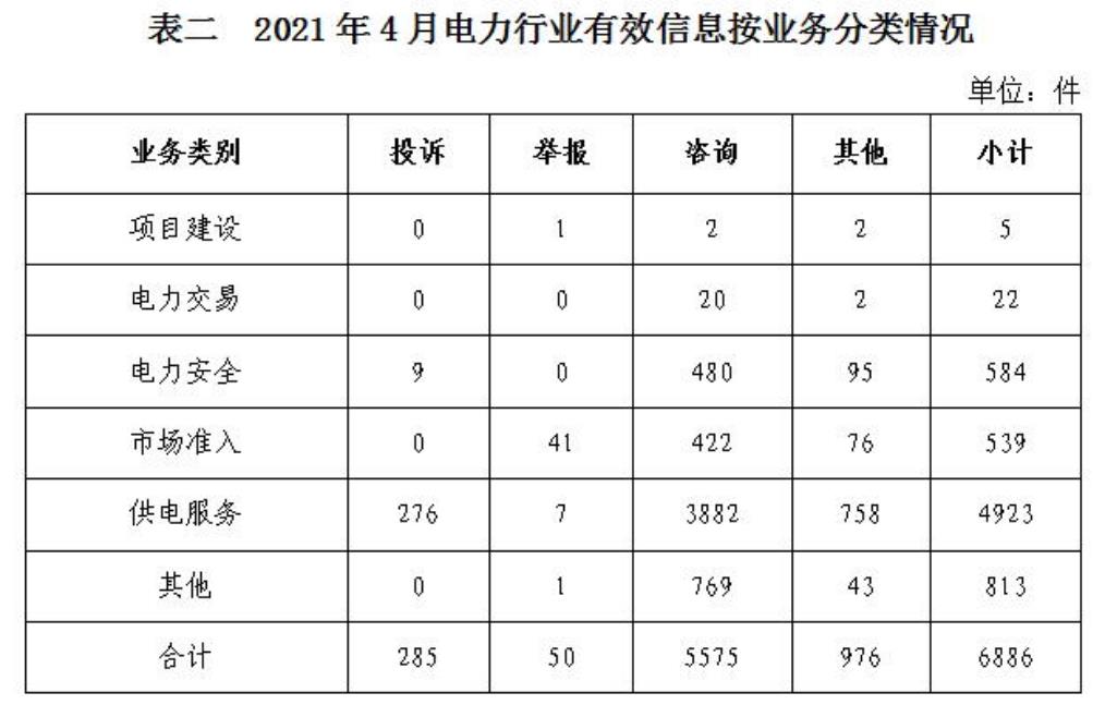 據(jù)國家能源局官網(wǎng)消息:2021年4月,國家能源局12398能源監(jiān)管熱線共收到有效信息8697件,其中電力行業(yè)排在首位,有效信息數(shù)量為6886件,占全部有效信息的79.18%,主要集中于故障停電、電費交納等方面。石油天然氣行業(yè)排在第二位,有效信息數(shù)量為564件,占全部有效信息的6.48%。主要集中于居民燃?xì)庠O(shè)備故障、費用交納等方面