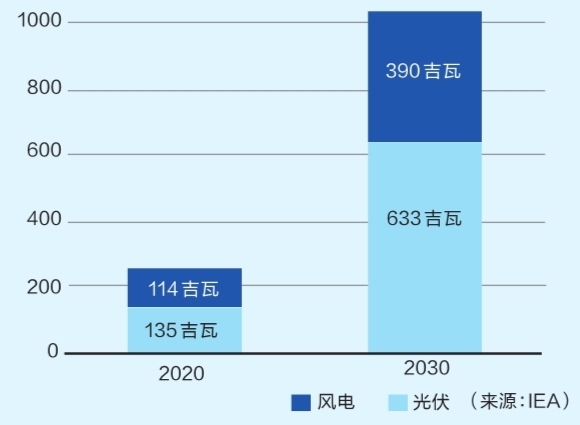 據(jù)此,報告認(rèn)為,未來十年里需迅速擴大太陽能和風(fēng)能的規(guī)模。到2030年,光伏發(fā)電年新增裝機630吉瓦,風(fēng)電年新增裝機390吉瓦,是2020年創(chuàng)下的記錄的4倍。對于光伏而言,相當(dāng)于每天安裝一個目前世界上最大的太陽能公園。