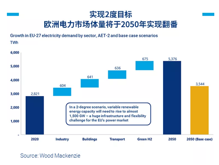 在AET-2場景中,到2050年前的電力需求基本需要翻倍,達(dá)到5,376TWh(基本預(yù)測數(shù)據(jù)為3,544TWh),具體如下圖所示。由于電動汽車充電、工業(yè)生產(chǎn)及民用采暖需求加大,大多數(shù)新增需求將由綠色氫能源滿足。