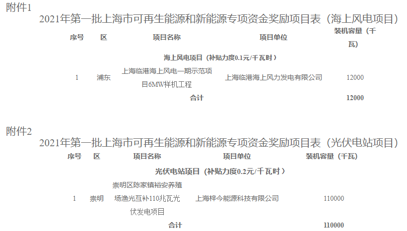 1.2021年第一批上海市可再生能源和新能源專項資金獎勵項目表(海上風(fēng)電項目)1個