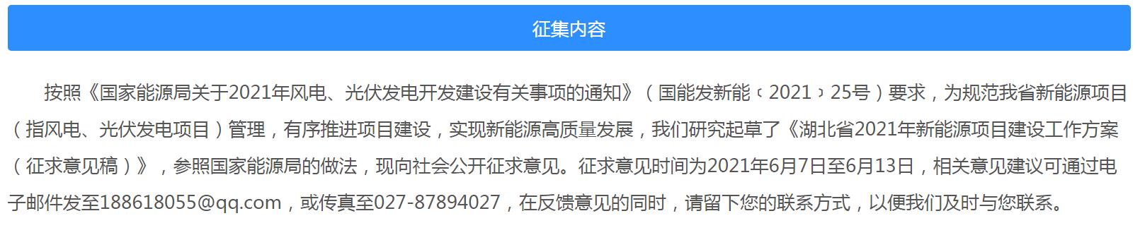 據(jù)湖北發(fā)改委官網(wǎng)消息:為規(guī)范新能源項目(指風電、光伏發(fā)電項目)管理,有序推進項目建設(shè),實現(xiàn)新能源高質(zhì)量發(fā)展,湖北省能源局制定印發(fā)《湖北省2021年新能源項目建設(shè)工作方案(征求意見稿)》,現(xiàn)向社會公開征求意見。