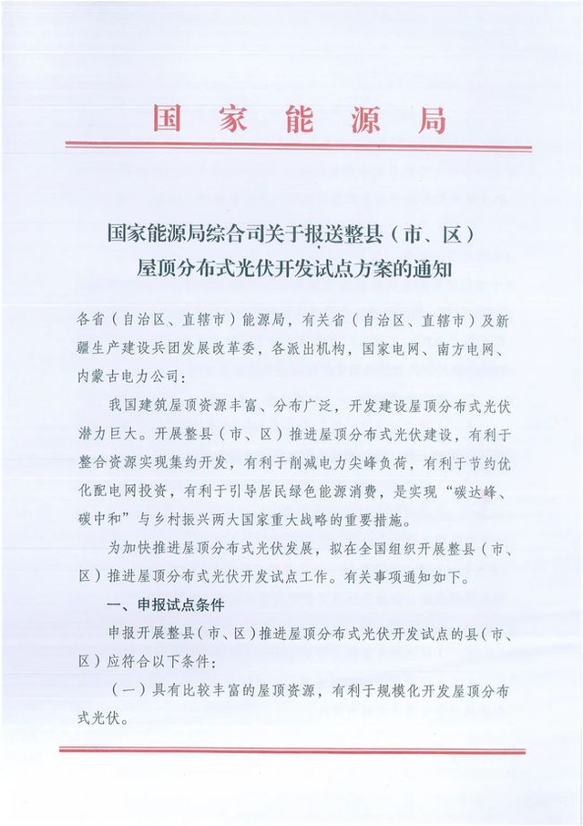 近日,國(guó)家能源局綜合司下發(fā)《關(guān)于報(bào)送整縣(市、區(qū))屋頂分布式光伏開發(fā)試點(diǎn)方案的通知》。