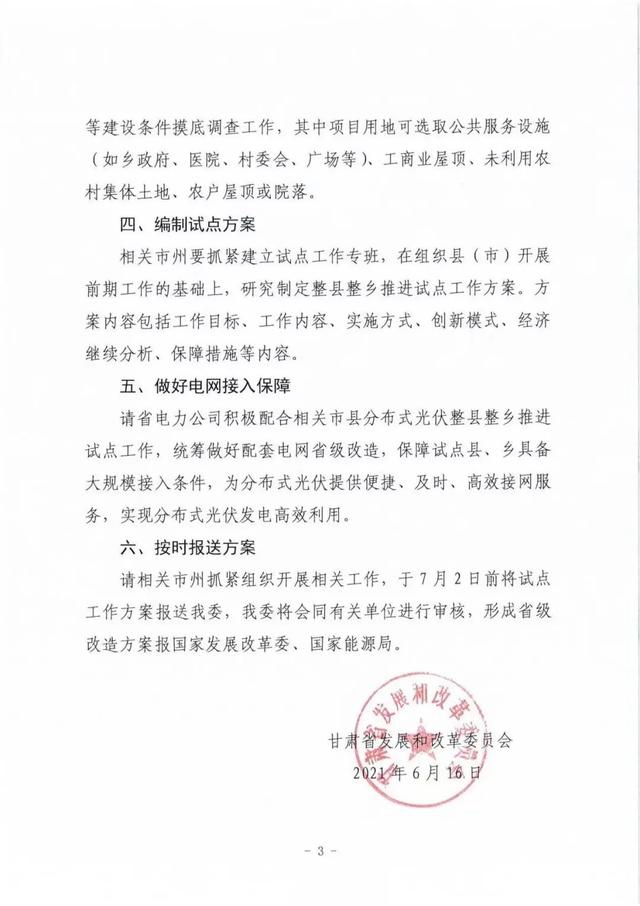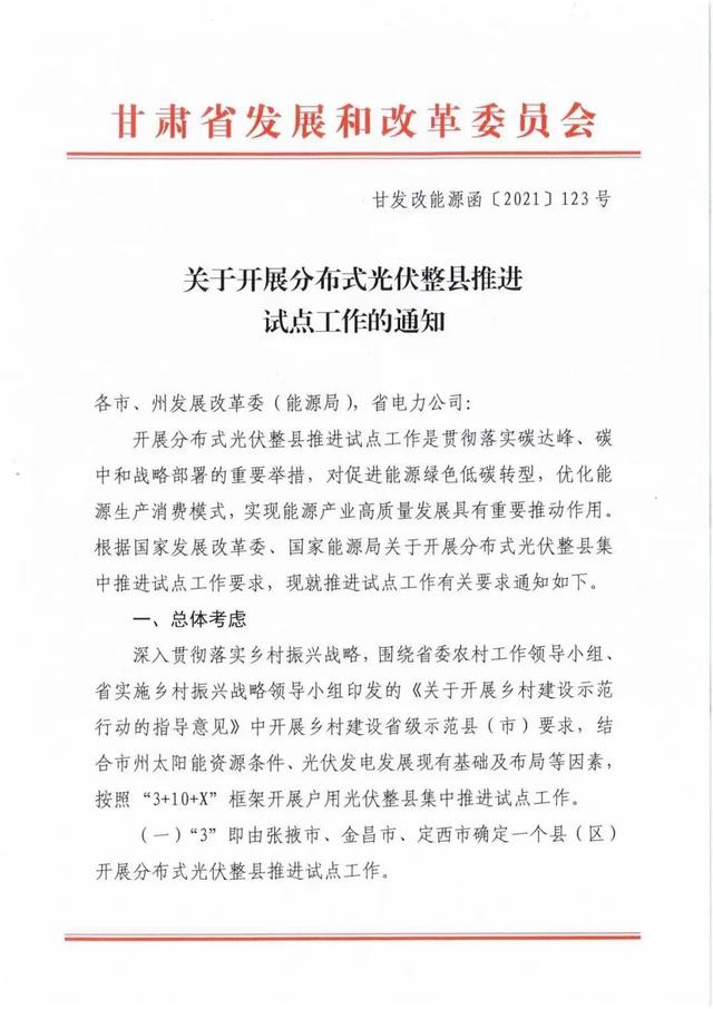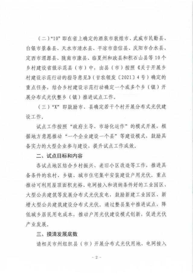 甘肅近日下發(fā)了《關于開展分布式光伏整縣推進的試點工作的通知》。全文如下: