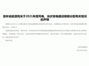 今日,吉林省能源局發(fā)布關(guān)于2021年度風(fēng)電、光伏發(fā)電建設(shè)規(guī)模分配有關(guān)情況的聲明指出:依據(jù)國家相關(guān)政策,吉林省風(fēng)電、光伏發(fā)電項目年度新增建設(shè)規(guī)模由國網(wǎng)吉林省電力有限公司依據(jù)省內(nèi)電力消納空間確定,省政府統(tǒng)一研究決定,具體內(nèi)容將在省能源局官網(wǎng)發(fā)布,請以此為準。非官方媒體編造、變造并發(fā)布不實信息,將依法追究其責(zé)任