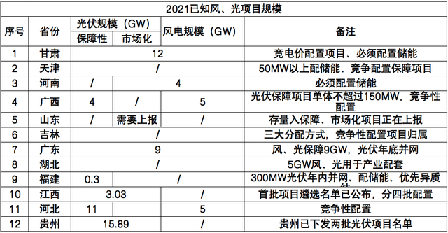 截止到目前為止,甘肅、河南、天津、河北、廣西、山東、吉林、廣東、湖北、江西、貴州等十一省市已陸續(xù)公布2021年風、光項目建設管理辦法或競爭性配置文件,各省市2021年明確安排的風、光規(guī)模已經達到69.19GW。