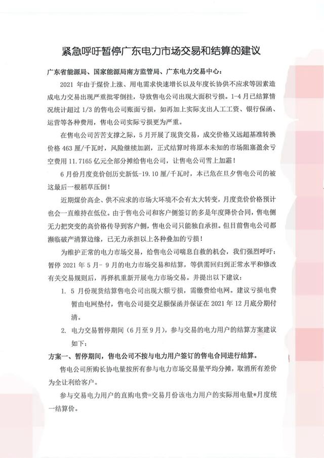 近日,據(jù)廣東某民營售電公司人員透露,廣東多家獨立民營售電公司,聯(lián)合向政府主管部門及交易中心致函,建議暫停廣東電力市場交易和結(jié)算。建議函主要描述了上半年廣東電力市場出現(xiàn)的嚴重“批零倒掛”現(xiàn)象,售電公司,尤其是獨立民營售電公司出現(xiàn)大面積嚴重虧損,甚至瀕臨破產(chǎn)退市,并建議政府基于目前一次能源價格高企,供需情況急劇變化的情況,暫停電力市場交易及結(jié)算。