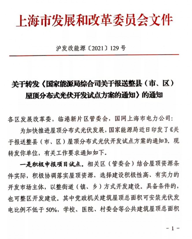6月25日,上海發(fā)改委下發(fā)關(guān)于轉(zhuǎn)發(fā)《國家能源局綜合司關(guān)于報(bào)送整縣(市、區(qū))屋頂分布式光伏開發(fā)試點(diǎn)方案的通知》的通知,要求積極申報(bào)項(xiàng)目試點(diǎn),高質(zhì)組織方案編制,加大政策支持力度。