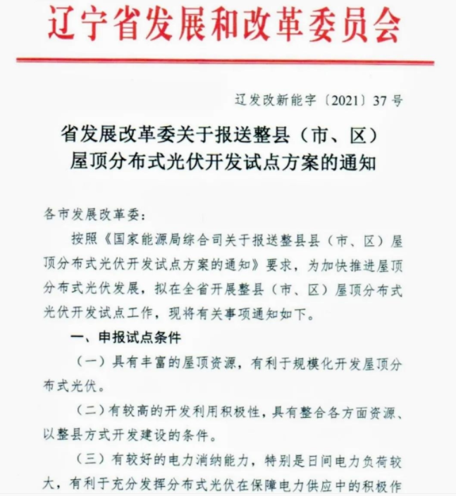 日前,遼寧省發(fā)改委印發(fā)通知,正式啟動(dòng)分布式光伏整縣推進(jìn)試點(diǎn)。通知明確,申報(bào)試點(diǎn)要具有豐富的屋頂資源,有較高積極性和較好電力消納能力,鼓勵(lì)項(xiàng)目整體打包備案,通過(guò)財(cái)政補(bǔ)貼、整合鄉(xiāng)村振興各類項(xiàng)目資金等方式給予支持。原則上每個(gè)市上報(bào)一個(gè)試點(diǎn)項(xiàng)目,每個(gè)試點(diǎn)項(xiàng)目確定一家項(xiàng)目業(yè)主,對(duì)消納條件好、市級(jí)支持政策條件優(yōu)、經(jīng)濟(jì)可行性高的申報(bào)項(xiàng)目?jī)?yōu)先納入全省試點(diǎn)方案,并于7日5日前報(bào)送發(fā)改委。